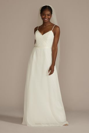 This A-line dress is perfect for a beach or courthouse wedding, and ideal for the bride who loves simple, effortless style. Delicate spaghetti straps top the scalloped lace surplice bodice, while a grosgrain sash nips the waist. A flowing chiffon skirt completes the look.