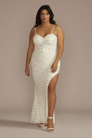 Sparkle is always the answer! Find yourself dazzling in this allover sequin lace wedding dress, complete with a sweetheart corset bodice, skirt slit, and delicate spaghetti straps.