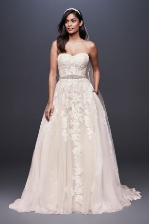 Delightfully alluring, the lace-appliqued, semi-sheer bodice of this airy tulle ball gown creates a delicate look for brides who take their romance with a side of daring.
