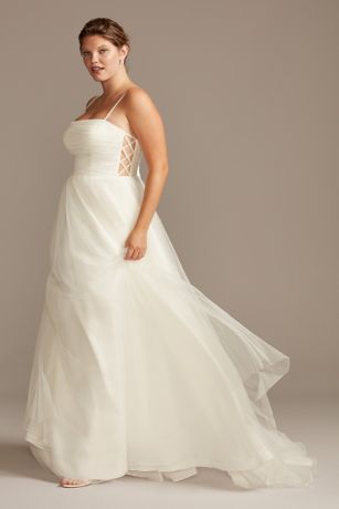 Romantic yet modern, this tulle wedding dress is detailed with a crisply pleated tulle bodice, beaded spaghetti straps, and lattice-motif side cutouts. Soft layers of tulle float down the A-line skirt to finish the look with dreamy flair.