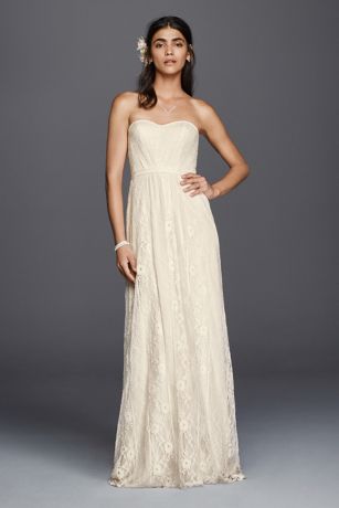 A linear pattern gives classic lace a fresh look and elongates the figure. The subtle sweetheart neckline and grosgrain ribbon at the waist add sweet details to this strapless sheath wedding dress.