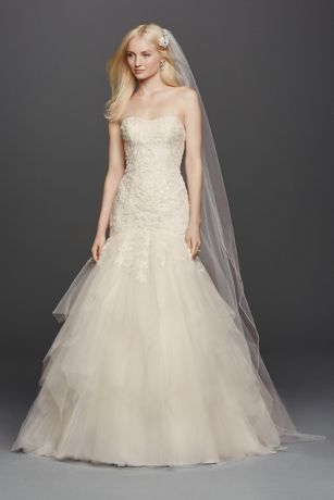 Love at first sight is what you will be feeling when you see this show-stopping strapless mermaid tulle wedding dress. Show off that hour glass figure you worked so hard for in this fitted gown featuring beaded embellishments, sweetheart neckline and a voluminous mermaid skirt with stunning hanky hem detailing. You won't be able to wait for your special day!
