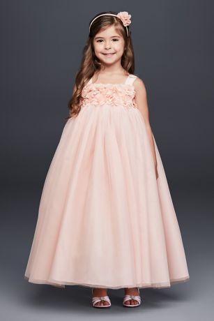 With a bodice bursting with flower petals and a full tulle skirt, this sweet flower girl dress is ready for duty. Polyester. Includes attached ribbon. Dry clean. Imported.