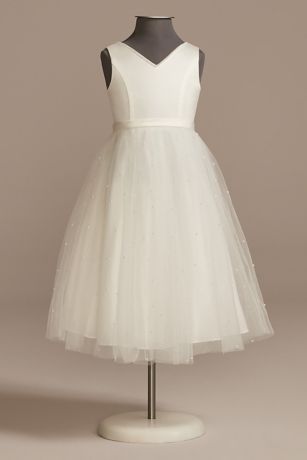 Dainty little pearls dot the tulle skirt and trim the V-neck and V-back of this tea-length flower girl dress. Finished with a grand satin bow at the back waist.