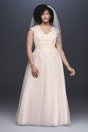Lace appliques trail from the V-neck, cap-sleeve bodice of this plus size A-line wedding dress, creating romantic detail. The flowing tulle skirt is layered over lace for extra dimension, with a buttoned illusion back perfect for a traditional bride.