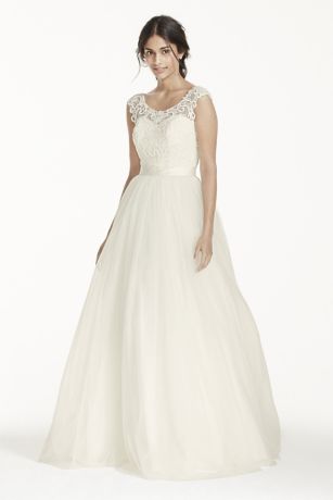 The path to true love follows a unique pattern all its own, much like this oh-so-pretty tulle ball gown. The scroll lace that adorns the bodice creates an elegant pattern that partners beautifully with the illusion cap sleeves. A flattering satin waistband completes the look.