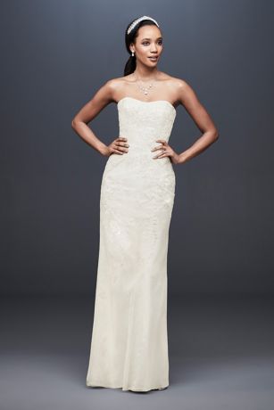 This lace sheath wedding dress is full of captivating details. An underlayer of glitter tulle and a crystal waistband add sparkle, while the removable A-line overskirt lets you switch up your look from the ceremony to the reception.