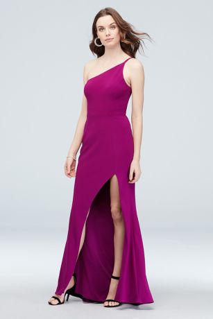 This stunning sheath is all about the angles! A sleek asymmetric one-shoulder neckline transforms into a  looped double strap at the back of this chic, stretch jersey dress, finished with a dramatic slit skirt.