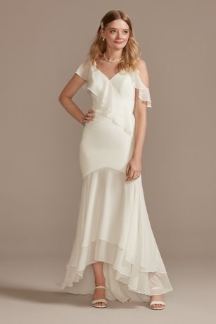Featuring an asymmetrical neckline, cascading ruffles at the bodice, and a layered high-low hem, this airy chiffon sheath dress is as romantic as it gets.
