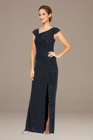 Reminiscent of Old Hollywood, this sequin and metallic gown is sure to steal the spotlight. The asymmetrical neckline and elegant slit adds an extra dose of drama.