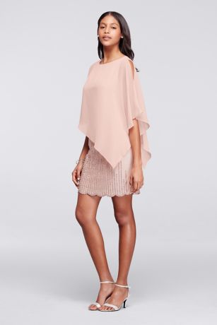 A linear-beaded underlay peeks out from beneath the airy chiffon shawl of this knee-length party dress.