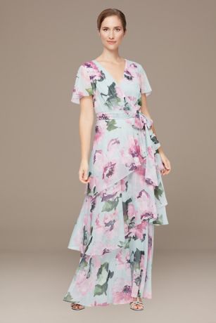 Asymmetrical tiers of layered chiffon fabric add eye-catching texture to this gorgeous floral printed floor length dress.
