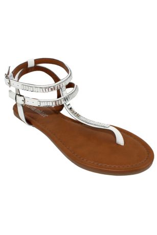 Two delicate straps embellished with baguette crystals make these sandals a shining choice.