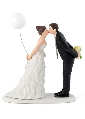This cake topper features a couple sweetly leaning forward for a kiss as husband and wife! Wearing a beautiful bowed dress and clasping a balloon, this beautiful bride is shown leaning towards her one true love as he holds onto her bouquet.