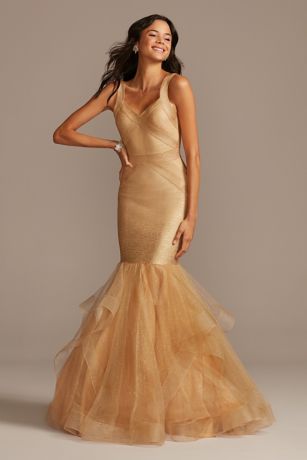 Bring on the drama in this statement-making mermaid gown with a bandage-style bodice that hugs every curve. Featuring a V-neck and plunging back, with a glitter tulle skirt finished in horsehair trim that falls into voluminous waves.