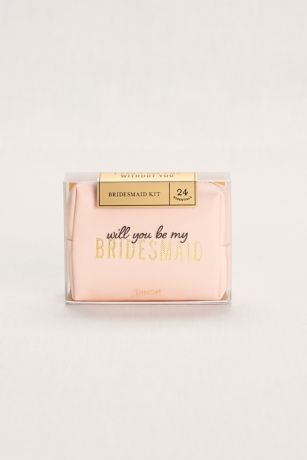 Ask your bestie to stand by you on your big day with this purse-friendly Mimimergency Kit that asks, "Will you be my" on the packaging and says, "bridesmaid" on the kit itself. The cute kit includes clear nail polish, a mending kit, dental floss, an emery board, clear elastics, double-sided tape, stain remover, a deodorant towelette, a nail polish remover pad, adhesive bandages, mini blotting tissues, a safety pin, pain reliever, breath drops, extra wedding bands, antacid, facial tissues, earring backs, a tampon, hairspray, a mirror, a brush/comb, blister balm, and bobby pins.
