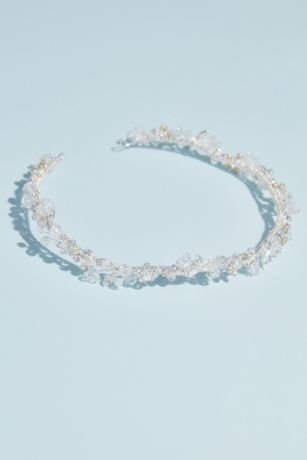 Soft, pretty, and luminous, this delicate crown is adorned with crystals and light-reflecting beads to create a delicate, sparkling band.