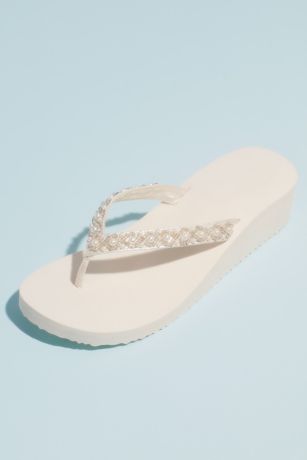 Dress up your beach look with these platform thong sandals. Satin straps embellished with beads and pearls elevate these shoes from poolside to party-ready.