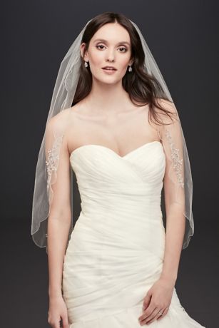 This beaded and embroidered scallop-edged veil is the perfect finishing touch for your big day. White and ivory options feature silver beading and embroidery; gold color option features gold beading and embroidery on an ivory veil.