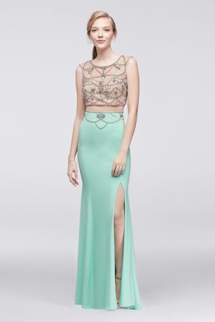 Dramatic lines of beading fall from the illusion bodice onto the slit jersey skirt of this chic gown.