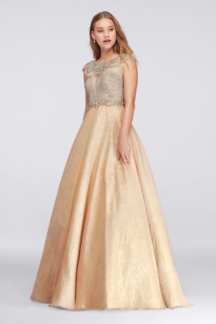 Ornate beading accents the illusion neckline and defines the waist of this grand ball gown, as metallic foil print creates an allover, marbleized pattern.