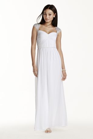 • Heavily beaded cap sleeves extend to back, providing a stunning detail.