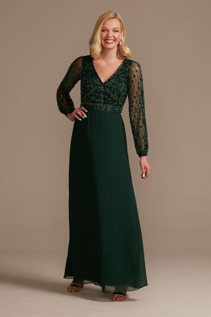 Romance is clearly in the air when you show up in this floor-length gown featuring an intricately beaded bodice, illusion sleeves, and a soft, sweeping chiffon skirt.