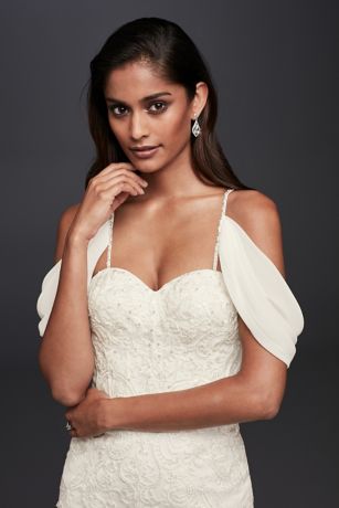 Regally draped swag sleeves and crystal beading along the neckline and back imbue this lace topper with romantic appeal. Wear it with your strapless wedding dress for a personalized look.