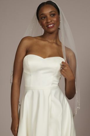 Airy, yet opulent, this mid-length veil is constructed from sheer tulle and embellished with intricate swirls of beaded clusters along the edges.