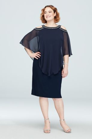 This short plus-size sheath dress gets a bit of drama from a beaded cold-shoulder chiffon capelet.