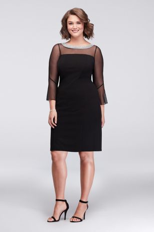 No necklace required when wearing this stunning crystal-collared plus-size sheath dress. A scoop neckline and illusion mesh bell sleeves add to its beauty.