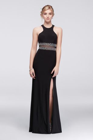 This sleekly contoured jersey dress, beaded at the illusion waistline, has a hidden surprise: eye-catching sea foam green lining that provides a pop of color.