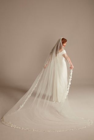 Delicately embroidered flowers float at the edge of this cathedral-length tulle veil.