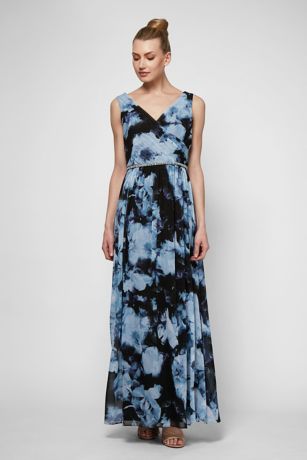 Long, luxurious, and flowy as can be, this printed chiffon maxi dress features a surplice neckline and a beautifully embellished waist.