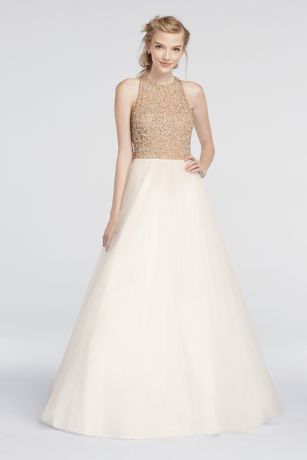 Simple and chic, you'll look and feel like a modern day princess in this beaded high neck prom gown! Trendy high neck bodice is adorned with sparkling crystal rhinestones over top an alluring nude underlay. Full, floor length ball gown tulle skirt finishes off this beautiful Prom look.