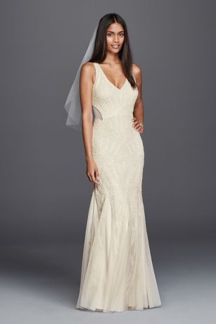 Look effortlessly stunning in this v-neck sheath wedding dress with gorgeous all-over beaded detailing. The long flowing skirt with godets adds great movement while the back features both open and illusion side panels for a very romantic look!