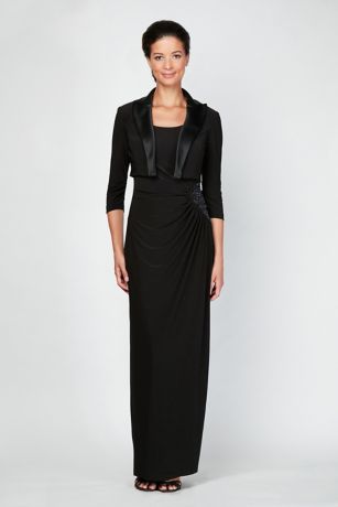 A touch of beading at the waist adds just enough detail to this jersey dress, while a satin-trimmed bolero jacket completes the look.