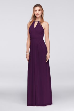 This slim-yet-flowing mesh gown is finished with a beaded collar atop a pretty keyhole neckline.