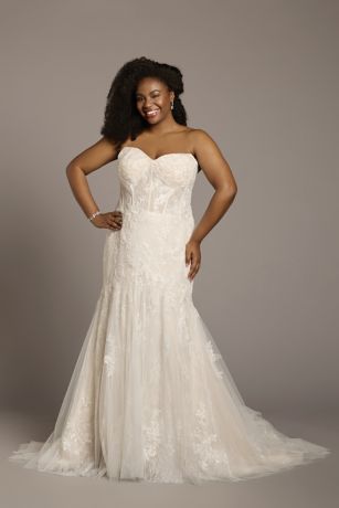 A: David's Bridal designs this dress to be inclusive, offering sizes from 0 to 26W. The mermaid silhouette can be beautifully tailored to complement various body shapes, with customizable alteration options to ensure a perfect, comfortable fit for every bride.