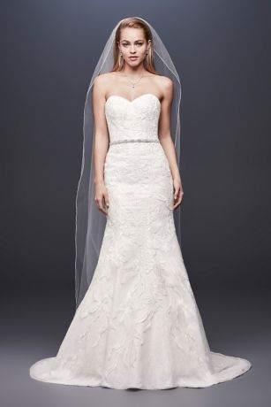 Tonal beading and sequins lend subtle sparkle to this strapless lace wedding gown, while the illusion mesh back and generously flared mermaid skirt adds a dash of drama.
