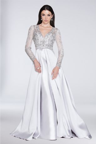 You'll be the belle of the ball in this long-sleeve gown, topped with a beaded illusion bodice and finished with a pleated mikado overskirt.