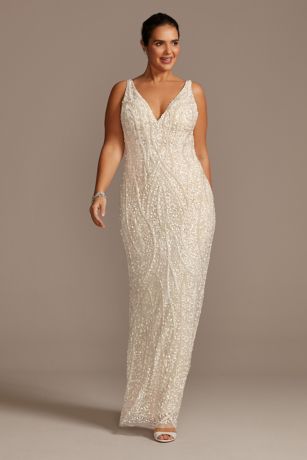 This sheath dress is covered in a pattern of hand-beaded details and matte sequins. A plunging V-neckline and V-back add drama to the curve-hugging fit.