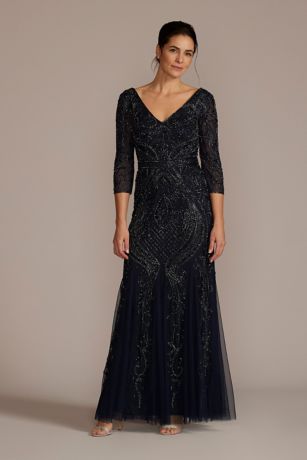 The mother of the bride or groom will certainly have her moment to shine in this elegant mermaid gown featuring a flattering V-neckline, allover beading, and tulle godets.