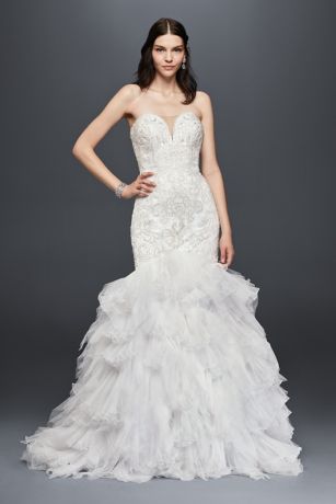An illusion panel subtly spans the plunging sweetheart neckline of this form-fitting beaded mermaid gown, as layer upon layer of pleated tulle flutter dreamily with each and every step.