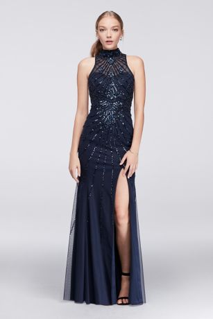 Dial up the drama in this glittering gown. Beaded in a dazzling design from the high neckline to the long skirt, and open at the back, this dress is the head-turner you've been looking for. This style is exclusive to David's Bridal.