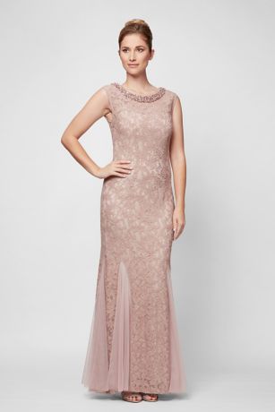 This long lace mermaid dress is a lovely choice for the mother of the bride and wedding guests. Finished with a beaded neckline and hemline godets that make the skirt move gracefully.