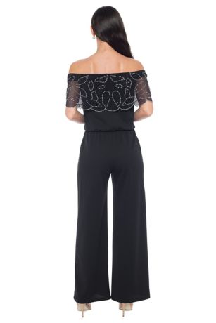 Elevate your look with this beaded off-the-shoulder scuba crepe jumpsuit, combining modern sophistication with intricate detailing. A bold and elegant choice for the mother of the bride or groom, perfect for making a statement in style.