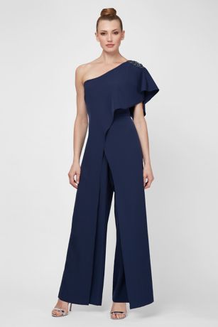 Beaded One-Shoulder Jumpsuit with Chiffon Overlay
