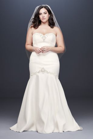 Smooth, sleek and sophisticated, this form-fitting strapless satin wedding gown features detailed beaded trim at the neckline and trumpet skirt. Layers of satin and tulle cascade to complete the mermaid silhouette.