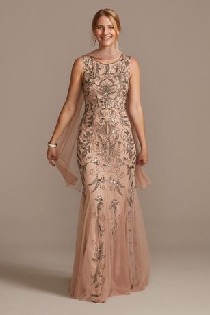 Metallic sequins outlined with intricate beadwork form beautiful scroll embellishments on this evening dress. A floaty mesh overlay and matching shawl lend a romantic vibe to the elegant occasion look.